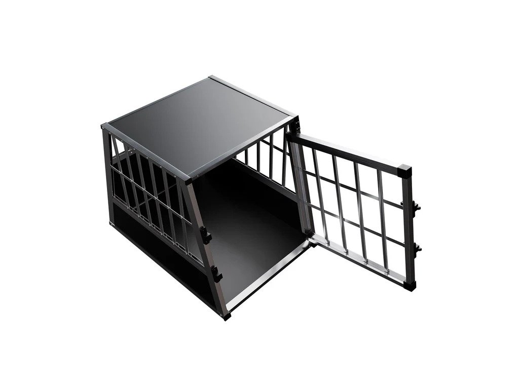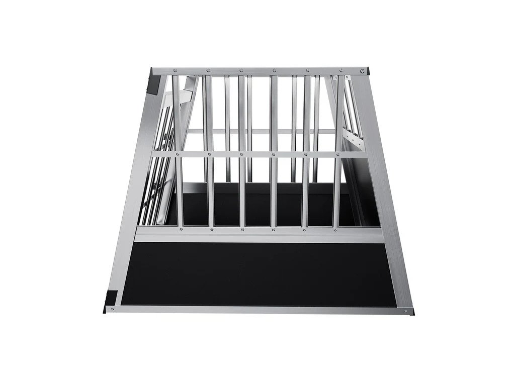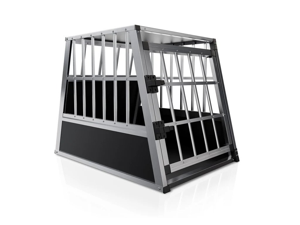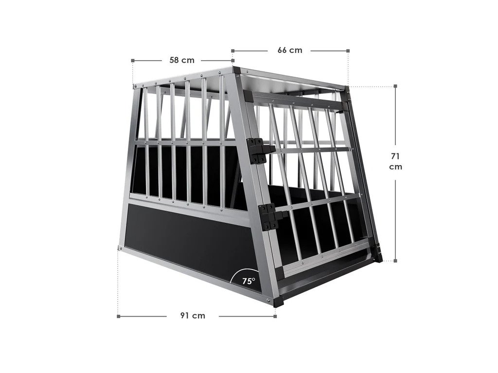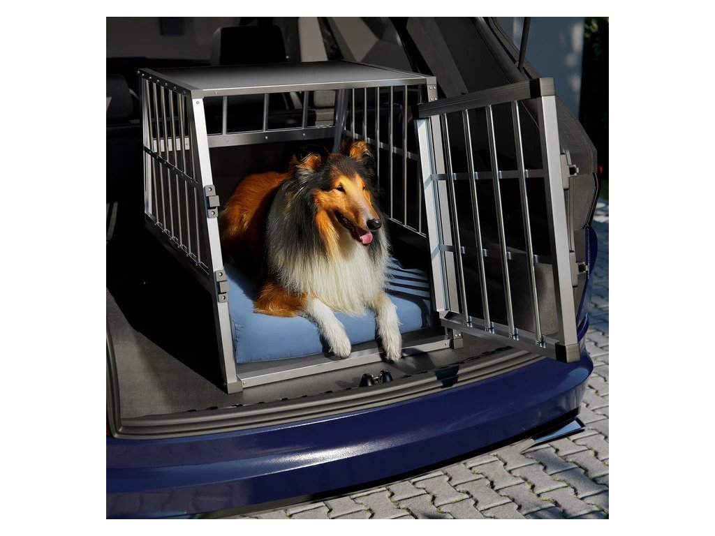 Box na bezpečnou přepravu psů L. S hliníkovým přepravním boxem pro psy L můžete přepravovat středně velké psy pohodlně a bezpečně. Uložte box do kufru nebo ho připněte na zadní sedadlo auta. Díky lichoběžníkové struktuře se přepravní box vejde do kufru nebo na zadní sedadlo mnoha modelů automobilů. Je vysoký 71 cm, má podlahovou plochu 66 × 91 cm a dá se rychle připevnit k autu. Skvrny lze ze síťové krabice snadno odstranit vlhkým hadříkem. Cestovní box odolný vůči korozi je vyroben z dýhovaných dřevěných panelů MDF a hliníkové síťoviny. Tato kombinace zajišťuje prvotřídní stabilitu a dlouhou životnost. Díky nízké hmotnosti ho zároveň lze bez námahy zvednout z kufru. Dveře lze bezpečně uzamknout zámkem.