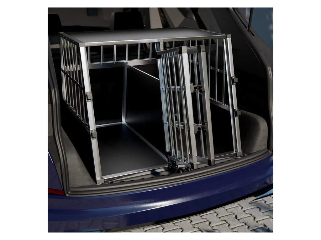 Box na bezpečnou přepravu psů XL. S hliníkovým přepravním boxem pro psy XL můžete přepravovat velké psy pohodlně a bezpečně. Uložte box do kufru nebo ho připněte na zadní sedadlo auta. Díky lichoběžníkové struktuře se přepravní box vejde do kufru. Je vysoký 71 cm, má podlahovou plochu 96 × 90 cm a dá se rychle připevnit k autu. Skvrny lze ze síťové krabice snadno odstranit vlhkým hadříkem. Cestovní box odolný vůči korozi je vyroben z dýhovaných dřevěných panelů MDF a hliníkové síťoviny. Tato kombinace zajišťuje prvotřídní stabilitu a dlouhou životnost. Díky nízké hmotnosti ho zároveň lze bez námahy zvednout z kufru. Dveře je možné bezpečně zamknout zámkem.