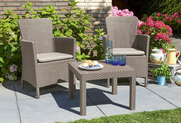 Pokud je váš balkon trošku velkorysejší, možná vám učaruje náš balkonový set Salvador v barvě capuccino, vyrobený z lisovaného plastu v imitaci ratanu. Použitý materiál zaručí dlouhou trvanlivost a odolnost vůči vodě a UV záření, křesílka s poduškami vám zase poskytnou extra komfort. Z podobného materiálu, konkrétně z polyratanu, je vyroben i set Bayamo v černé barvě s elegantním kulatým stolkem se skleněnou deskou. Prožije s vámi mnoho slunečných i deštivých sezón.