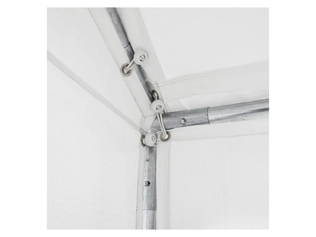 Party stan má pevný ocelový trubkový rám. Spoje se snadno montují pomocí posuvného systému, který usnadňuje montáž a demontáž. Ukotvení pomocí napínacích šňůr a kolíků zajišťuje stabilitu během používání.