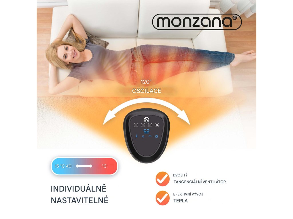 Díky silnému výkonu 2 000 wattů se ohřívač okamžitě postará o příjemné teplo. Ventilátor má 4 různé režimy - režim ventilátoru, střední ohřev, vysoký ohřev a úsporný režim ECO. Uvnitř ohřívače je dvojitý tangenciální ventilátor, který je tichý a efektivní při distribuci vzduchu. Ventilátor má také časovač 1-12 hodin a noční režim. Oscilaci s úhlem 120° lze jednoduše zapnout nebo vypnout. Keramický ohřívač ventilátoru lze ovládat pomocí dálkového ovladače nebo pomocí dotykového displeje, který je umístěn na horní straně zařízení. Robustní kovová mřížka před topným tělesem, jakož i ochrana hrotu a ochrana proti přehřátí zajišťují vaši bezpečnost. Ventilátor lze rychle a snadno přepravovat pomocí integrované rukojeti a kompaktním rozměrům.Výhody produktu: