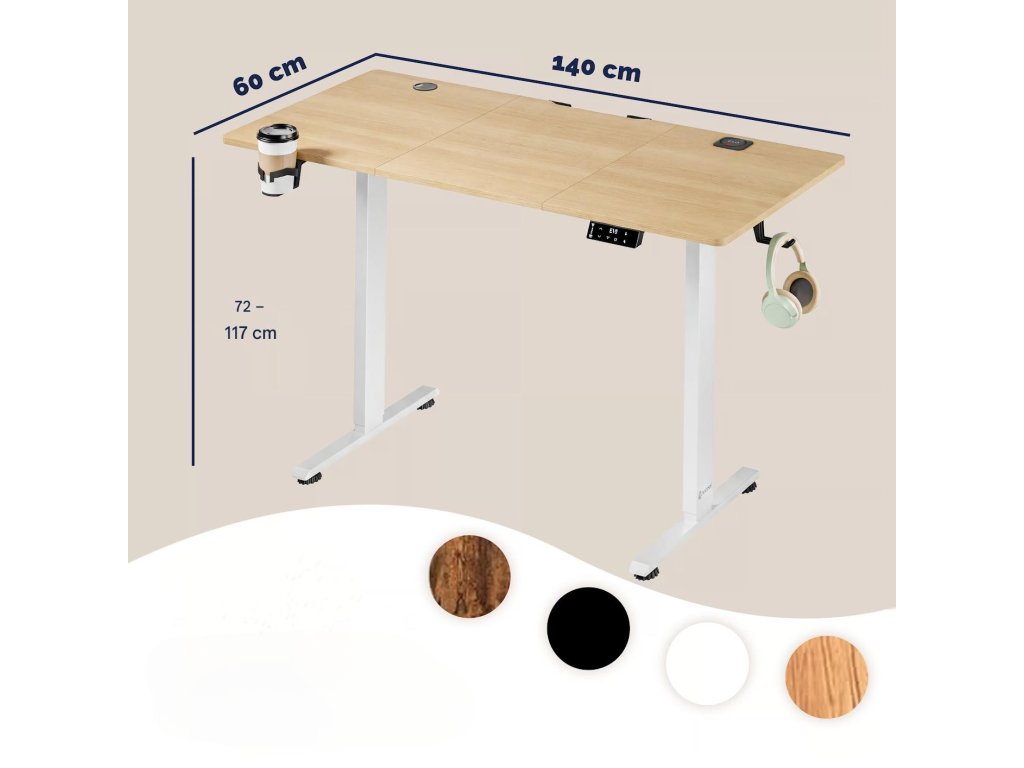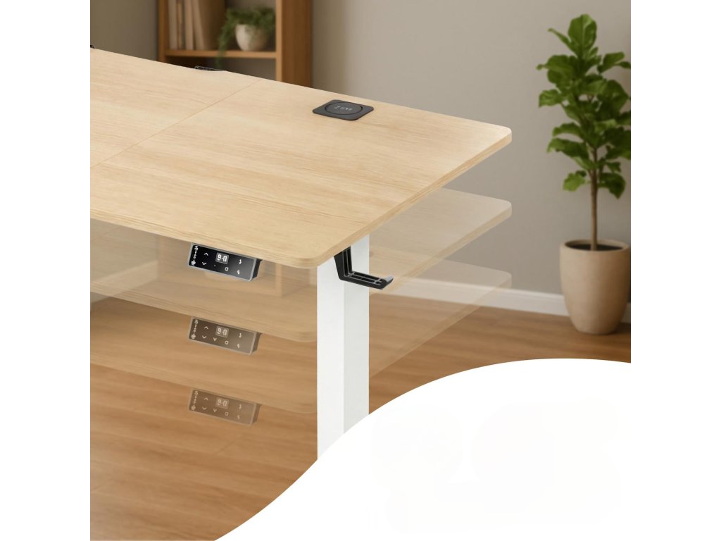 Stůl je vybaven elektrickým motorem, který umožňuje plynulé nastavení výšky v rozsahu od 72 do 117 cm. Ovládací panel s LCD displejem nabízí možnost uložení dvou výškových pozic, díky čemuž je přepínání mezi prací vsedě a vestoje rychlé a jednoduché. Tichý chod mechanismu zajišťuje nerušené používání v kanceláři i doma.